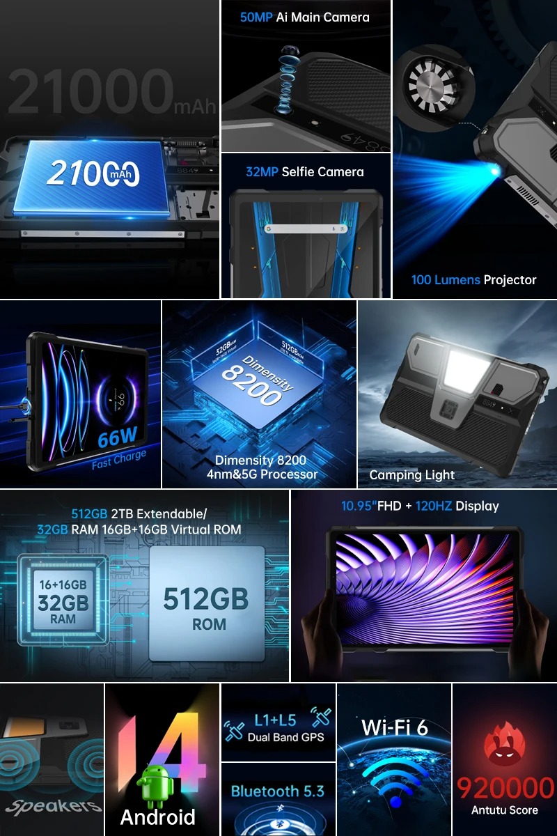 La 8849 TANK PAD es una tablet/Smartphone innovadora y ultra resistente diseñada para usuarios que buscan una herramienta multifuncional y de alta durabilidad. Esta tablet, lanzada recientemente, combina la funcionalidad de un proyector de 100 lúmenes, una pantalla de 10,95 pulgadas a 120 Hz, y una batería de larga duración de 21000 mAh, lo que la convierte en una opción ideal para el trabajo en exteriores y situaciones extremas. Además, cuenta con tecnología de conectividad 5G, certificación IP68/IP69K y un sistema Android 14 para ofrecer la experiencia de uso más actual y resistente.
